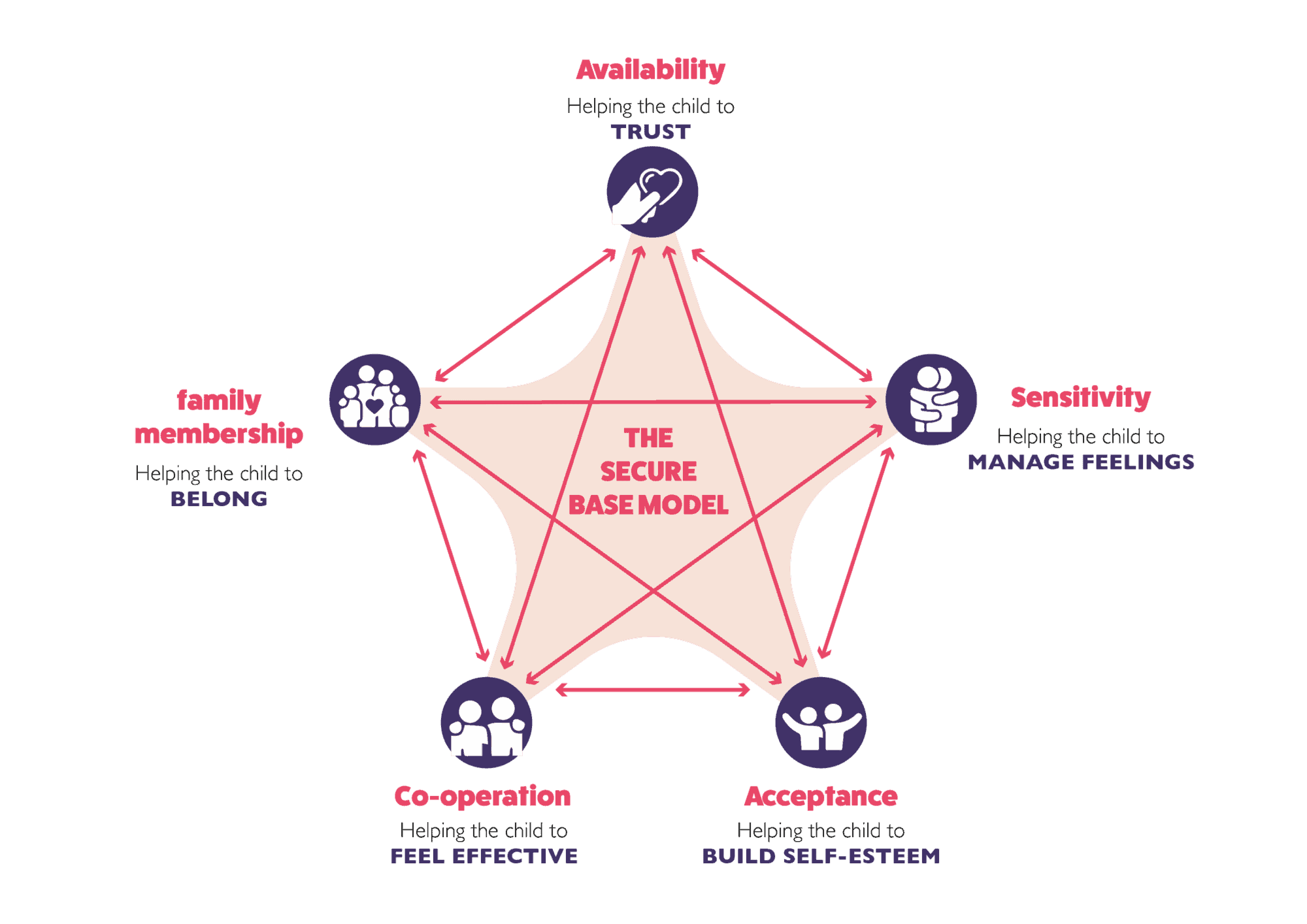 Drawn from attachment theory and adapted to include an additional element of family membership, the Secure Base Model outlines five dimensions of caregiving. These dimensions are interrelated, with each contributing to a specific area of the child’s development. By integrating this model into our therapeutic care, we help ensure that our children feel confident, competent, and resilient.